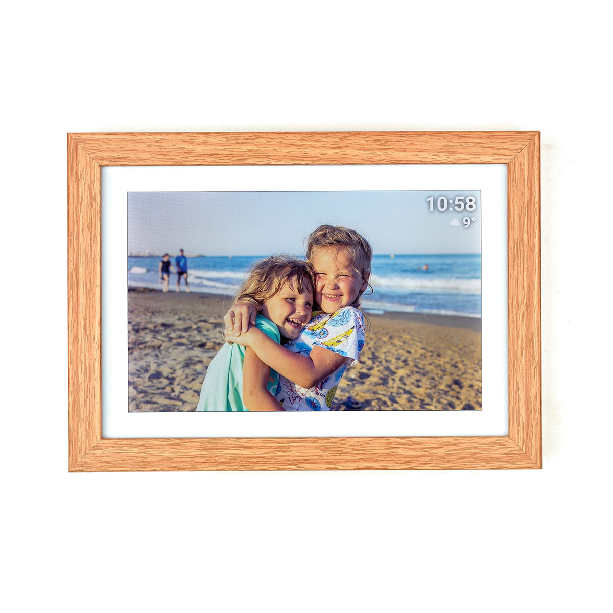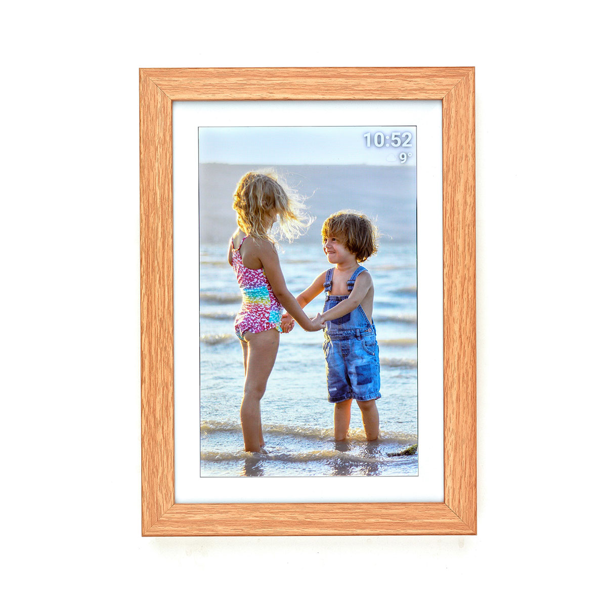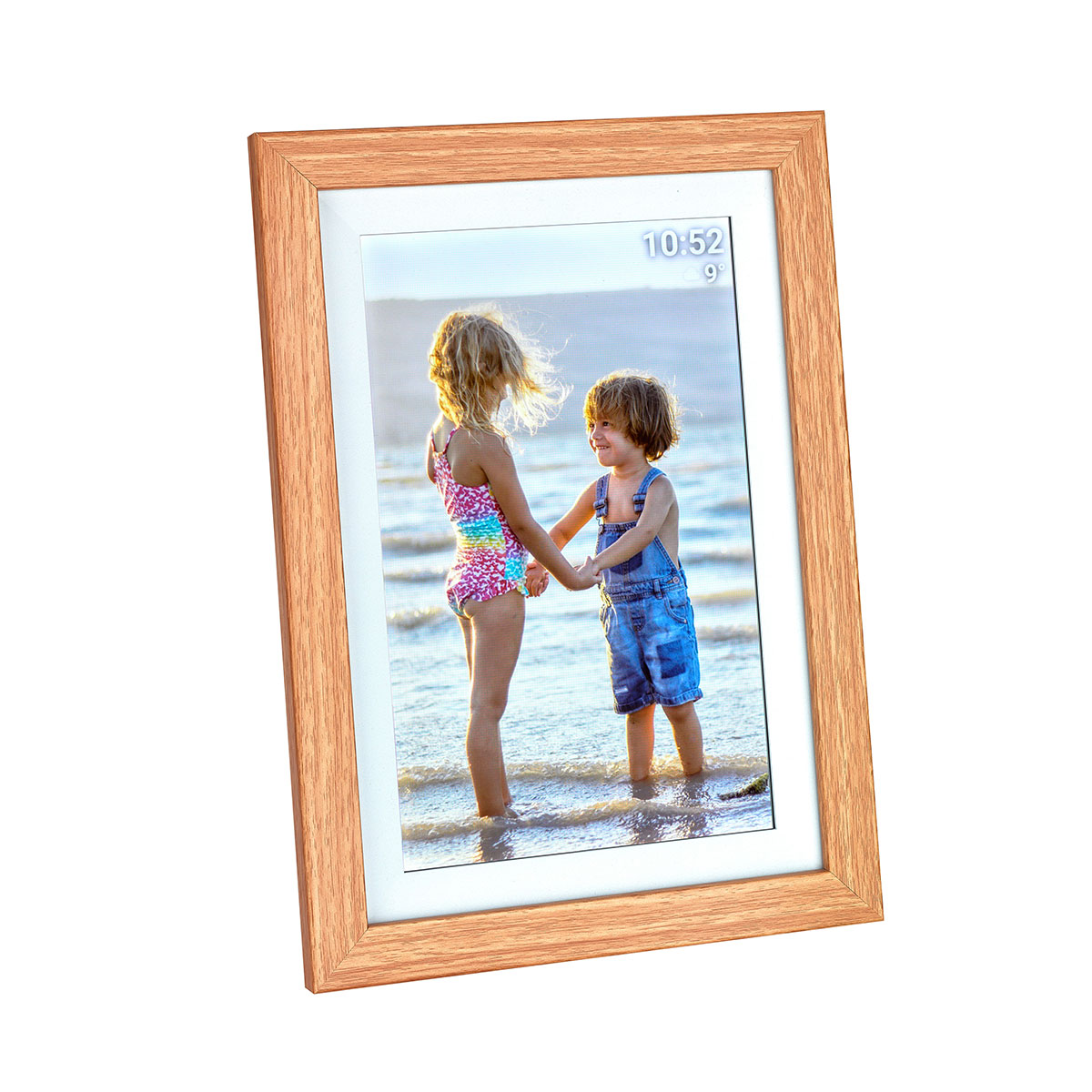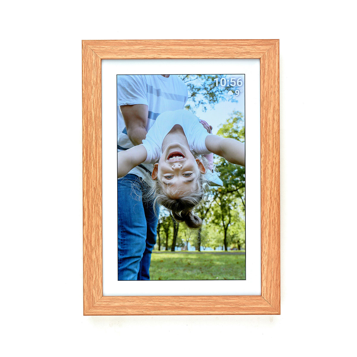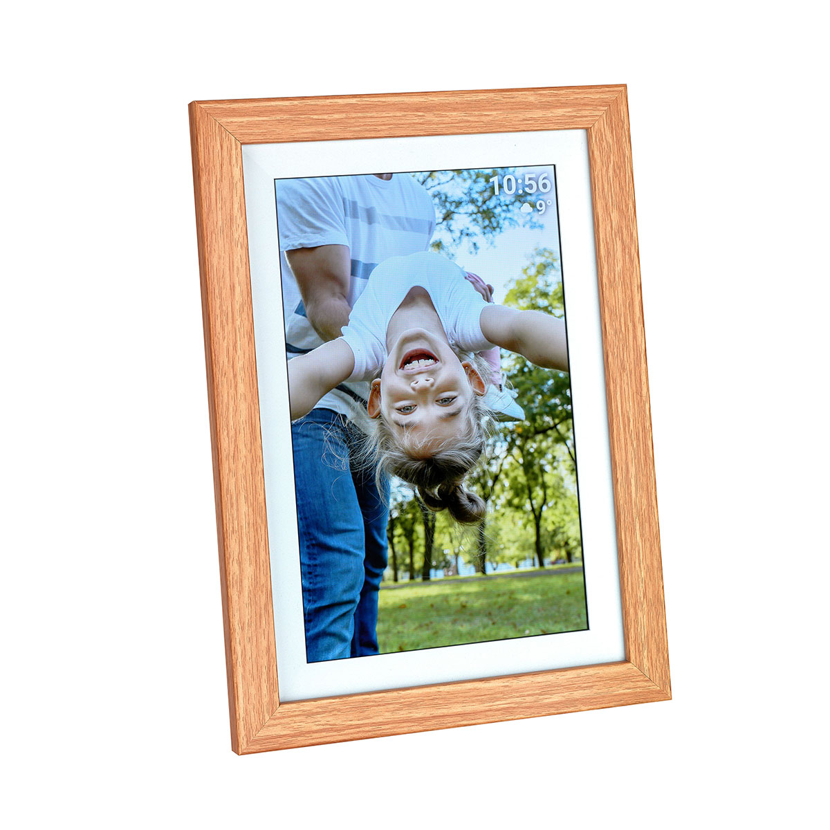 Der digitale Bilderrahmen FRAMEO besitzt einen hellen Rahmen in Holz-Optik, den Sie mithilfe des Standfußes sowohl im Quer- als auch im Hochformat aufstellen können. Oder Sie hängen ihn an die Wand, auch dafür sind mit der Aufhängeöse auf der Rückseite alle Vorkehrungen getroffen.